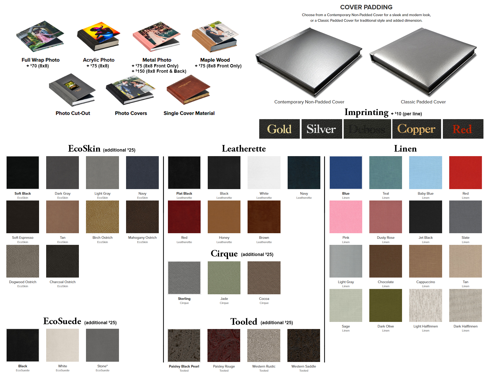 These lay-flat albums are the studio’s most popular hardbound style. This perfect bound, leather cover albums allow unlimited creativity and design opportunities for your family, children, senior and wedding images with true photographic panorama prints spreading across both sides of the book. Sizes available: 5×5, 7×10, 8×8, 10×10, 12×12